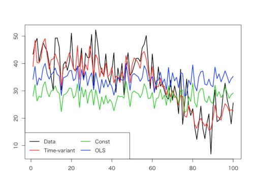 2週間前にふと思い立ってこんなことを試してみたわけですが。 よくよく考えてみたら「データを生成した真のモデルが時変係数&モデル推定も時変係数」でやってみた結果を並べただけで、これを(例えば)時不変係数モデルで推定してしまった場合や単なるOLS線…