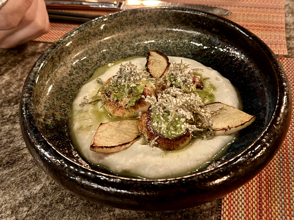 頼んだのは、ホタテのグリルとリブアイステーキ(と付け合わせのカニのコロッケ)。リブアイステーキは本当に備長炭で炙られながら供されていて、ちょっと面白かったです。流石はステーキハウスだけあって、前日のものより質の高いステーキでした。