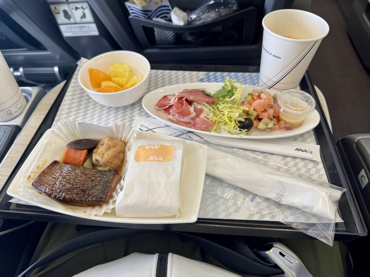 帰路はずっと日中のフライトゆえ、ずっと起きていて機内食もいただきました。プレエコなのでトレーに全部乗って出てくる形式ながら陶器製の皿でサーブされるというもので、お味の方もなかなかでした。