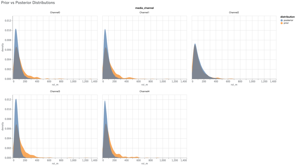 幾つかメソッドがありますが、とりあえず時系列プロットと事前・事後分布プロットだけ例として挙げておきます。Meridianでは事前分布に手を入れることが多いので、事前・事後分布プロットで「きちんと事前分布が機能しているか」「データが与える尤度の影響が十分か」を確認することが重要です。