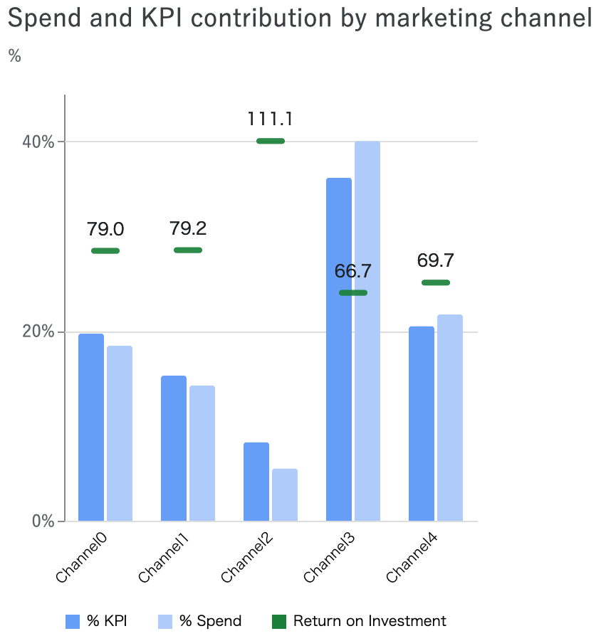 メディア効果の可視化メソッドは多岐に渡るので、例としてメディアごとの投下予算vs.貢献度比較とHill curveだけ挙げておきます。
