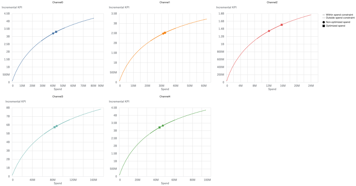 予算配分最適化計画に関しても幾つかメソッドがあるので、例として現状vs.最適化後比較プロットと現状vs.最適化後response curve比較プロットの2つを挙げておきます。