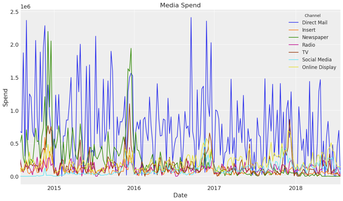 raw_df = pd.read_csv("https://raw.githubusercontent.com/sibylhe/mmm_stan/main/data.csv") # 1. control variables # We just keep the holidays columns control_columns = [col for col in raw_df.columns if "hldy_" in col] # 2. media variables channel_columns_raw = [ col for col in raw_df.columns if "mdsp_" in col and col != "mdsp_viddig" and col != "mdsp_auddig" and col != "mdsp_sem" ] channel_mapping = { "mdsp_dm": "Direct Mail", "mdsp_inst": "Insert", "mdsp_nsp": "Newspaper", "mdsp_audtr": "Radio", "mdsp_vidtr": "TV", "mdsp_so": "Social Media", "mdsp_on": "Online Display", } channel_columns = list(channel_mapping.values()) # 3. sales variables sales_col = "sales" data_df = raw_df[["wk_strt_dt", sales_col, *channel_columns_raw, *control_columns]] data_df = data_df.rename(columns=channel_mapping) # 4. Date column data_df["wk_strt_dt"] = pd.to_datetime(data_df["wk_strt_dt"]) date_column = "wk_strt_dt"
